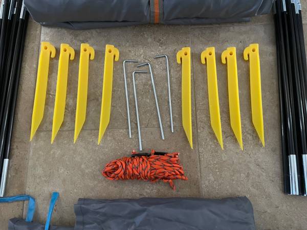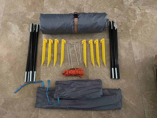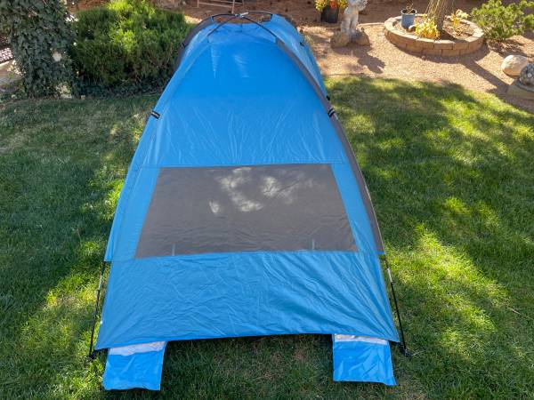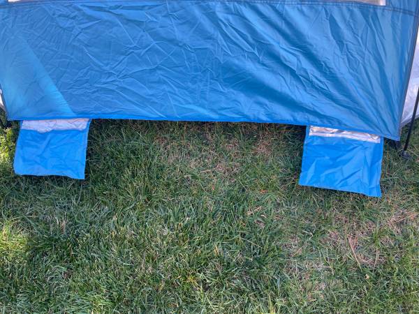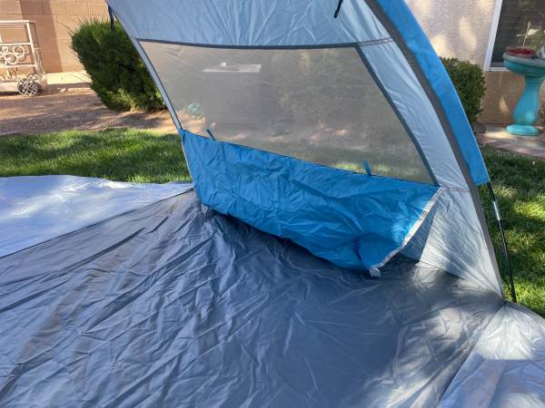 This 3 person Beach Tent has double doors w/double zippers for spacious and scenic camping. Can be used for overnighting or enjoy a day at the beach, park or game for shade. Dual roll down windows, interior storage pouches keep your goodie's off the ground. It's water resistant and has built in 4-corner sand bags and tie downs. 87"x55"x48". Included are 4 metal spikes, 8 plastic tie down spikes, tie down rope and storage bags. This tent was used once in my back yard for my granddaughters slumber party. I didn't even use the spikes, look at pictures, it's still like new and in perfect condition. Please text me if you're interested, leave me a message if you call.