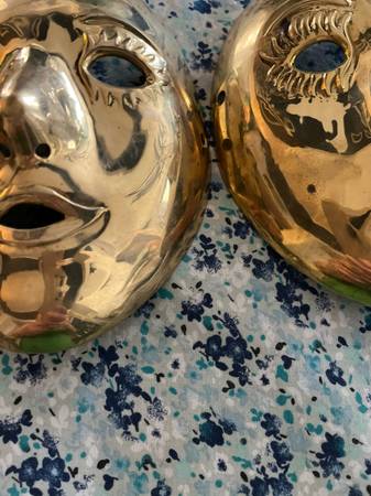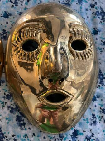 Vintage wall hanging brass mask set —great condition, set of three (measures about 7.5” height and 5.5” wide). Made in India—-$50.00 price is firm., please only serious buyers.
