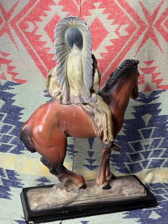 Vintage Indian Chief on a Horse Statue 13.5" Tall....this is really heavy. I don't know what material it is made out of. A magnet doesn't stick to it. I would guess a resin of some kind but it's too...