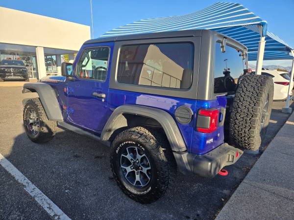 This 2019 Ocean Blue Metallic Clearcoat Jeep Wrangler Rubicon 4WD is well equipped and includes these features and benefits: 8.4 Radio & Premium Audio Group (1-Yr SiriusXM Guardian Trial, 4G LTE Wi-Fi Hot Spot, 5-Year SiriusXM Traffic Service, 5-Year SiriusXM Travel Link Service, 8.4 Touchscreen Display, Auto-Dimming Rear-View Mirror, Emergency/Assistance Call, For Details, Visit DriveUconnect.ca, GPS Navigation, HD Radio, Radio: Uconnect 4C Nav w/8.4 Display, SiriusXM Traffic Plus, and SiriusXM Travel Link), Cold Weather Group (Heated Front Seats and Heated Steering Wheel), LED Lighting Group (Daytime Running Lamps LED Accents, Front LED Fog Lamps, LED Reflector Headlamps, and LED Taillamps), Quick Order Package 24R, 4-Wheel Disc Brakes, 4.10 Rear Axle Ratio, 8 Speakers, ABS brakes, Air Conditioning, Alloy wheels, Alpine Premium Audio System, AM/FM radio: SiriusXM, Apple CarPlay/Android Auto, Automatic temperature control, Black 3-Piece Hard Top, Brake assist, Compass, Delay-off headlights, Driver door bin, Driver vanity mirror, Dual front impact airbags, Dual front side impact airbags, Electronic Stability Control, Freedom Panel Storage Bag, Front anti-roll bar, Front Bucket Seats, Front Center Armrest w/Storage, Front dual zone A/C, Front fog lights, Front reading lights, Fully automatic headlights, Garage door transmitter, Heated door mirrors, Illuminated entry, Integrated roll-over protection, Leather steering wheel, Low tire pressure warning, MOPAR All-Weather Floor Mats, No Soft Top, Non-Lock Fuel Cap w/o Discriminator, Occupant sensing airbag, Outside temperature display, Panic alarm, ParkView Rear Back-Up Camera, Passenger door bin, Passenger vanity mirror, Performance Suspension, Power door mirrors, Power steering, Power windows, Premium Cloth Low-Back Bucket Seats, Radio data system, Radio: Uconnect 4 w/7 Display, Rear anti-roll bar, Rear reading lights, Rear Window Defroster, Rear Window Wiper/Washer, Remote keyless entry, Remote Start System, Security system, Speed control, Steering wheel mounted audio controls, Tachometer, Telescoping steering wheel, Tilt steering wheel, Traction control, Trip computer, Variably intermittent wipers, Voltmeter, Wheels: 17 x 7.5 Machined w/Black Pockets, and Wheels: 17 x 7.5 Polished w/Black Pockets (DISC) Recent Arrival!