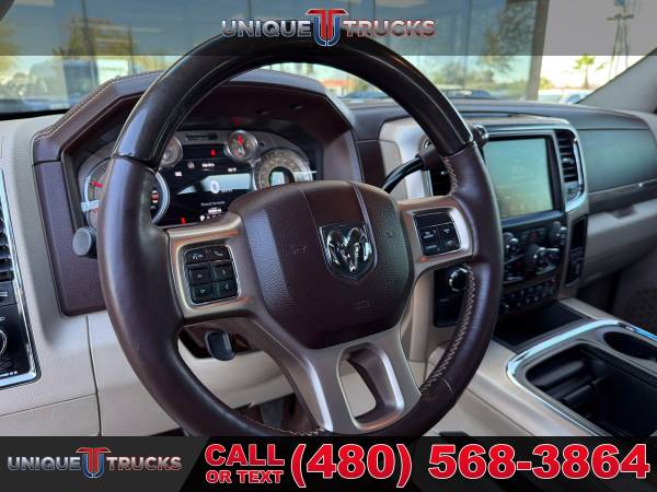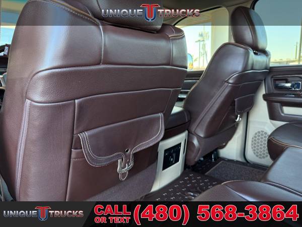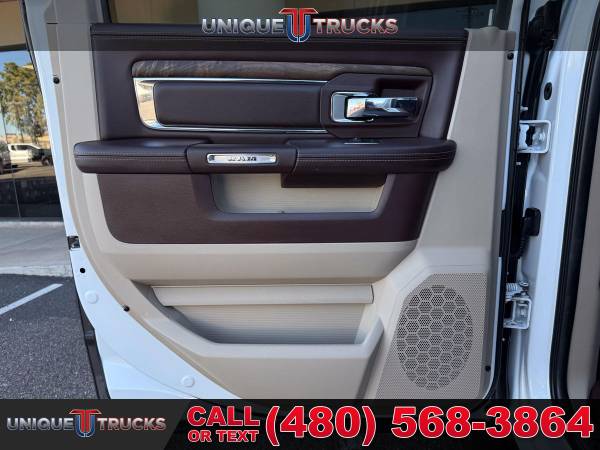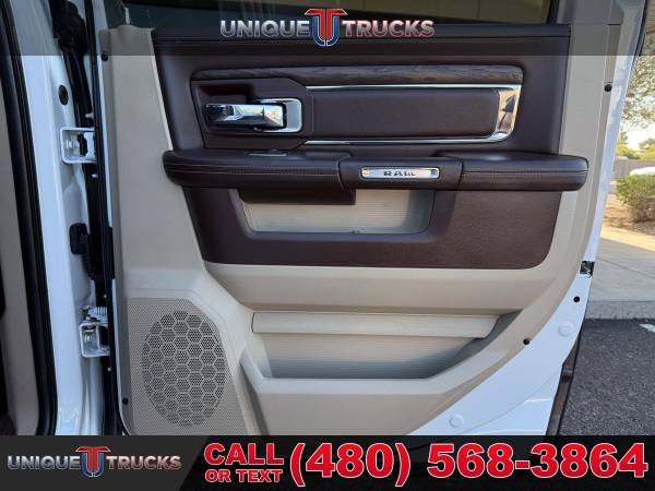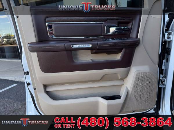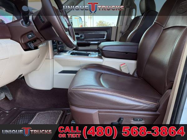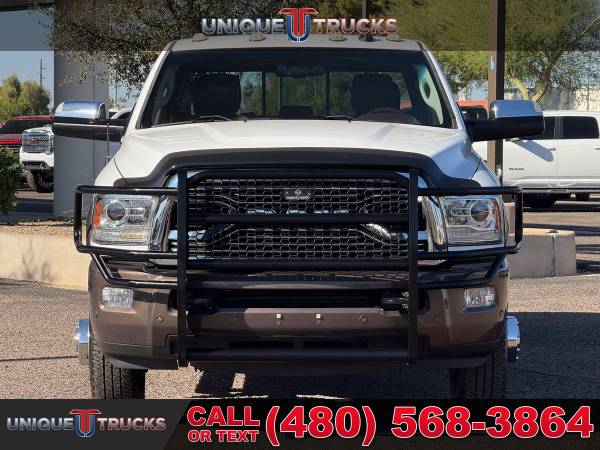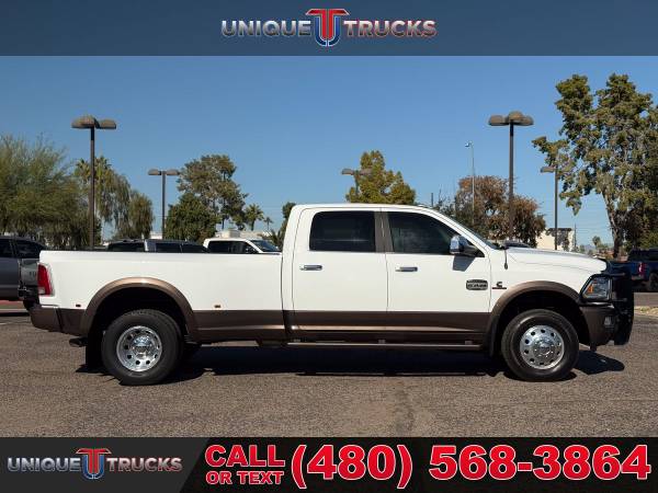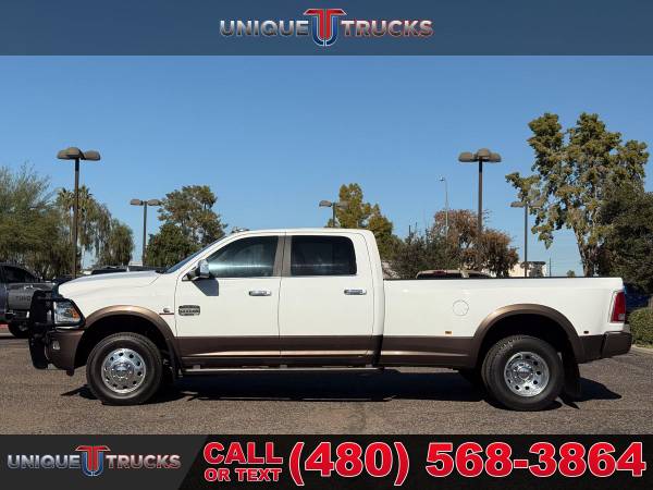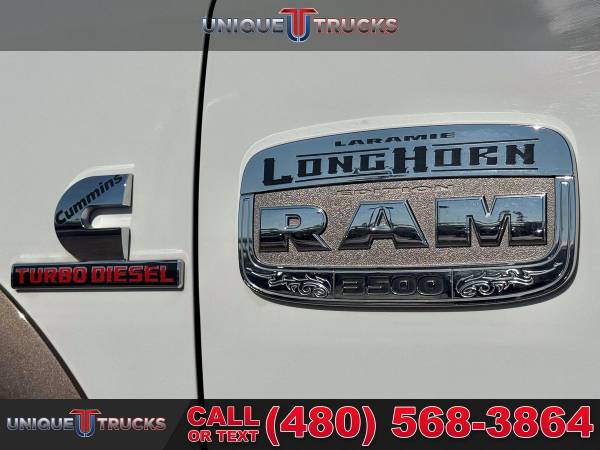 This clean one owner 2017 Ram 3500 Laramie Longhorn is the kind of truck that grabs attention the second it rolls by. From the wide dually stance to the long box and sharp Longhorn trim, this truck has a strong look that people notice right away.The Bright White clear coat exterior is paired perfectly with rich brown accent colors that give this truck a classic Longhorn style. Chrome trim, Longhorn badging, and clean body lines make this Ram stand out while still keeping a tough, work ready feel.This dually setup is built for serious towing and hauling. With dual rear wheels, a long bed, and the factory fifth wheel prep package, this truck is ready to handle heavy trailers, campers, horse trailers, or work loads with ease and confidence.Under the hood sits the trusted 6.7 liter I6 Cummins turbo diesel engine matched with the smooth AISIN 6 speed automatic transmission. This combo is known for strong pull, smooth shifting, and long life, making it a great choice for long trips or daily work use.Step inside and you are welcomed by the Laramie Longhorn interior finished in Canyon Brown and Light Frost Beige. The leather seats, wood accents, and detailed stitching give the cabin a clean, upscale feel that is still very comfortable and practical.This Ram also comes equipped with a front cattle guard, adding both protection and a bold look. It is perfect for long highway drives, rural roads, or added peace of mind when hauling or towing.Safety and control features include front and rear park assist, rear backup camera, trailer brake controller, electronic stability control, anti spin rear axle, and power folding tow mirrors. Everything is designed to help make towing and driving easier and less stressful.Inside tech and comfort are well covered with dual zone climate control, Uconnect 8.4 navigation, Bluetooth, Alpine sound system, heated and cooled front seats, heated rear seats, memory seats, heated steering wheel, and steering wheel audio controls.The exterior is finished off with spray in bedliner, LED bed lighting, locking tailgate, rear power sliding window, clearance lights, chrome grille with Ram lettering, and strong factory wheels that complete the dually look.This Ram 3500 Laramie Longhorn has been fully inspected and serviced and is ready for its next owner. At Unique Trucks, the price you see is the price you pay with no hidden markups or addendums, and we offer no obligation delivery right to your doorstep so you can test drive from home, make your best deal over the phone, and if you don’t like it, you don’t buy it. We love trade ins and invite you to come in and see this truck for yourself. ________________________ 2017* 2018* 2016* RAM* 3500* RAM TRUCKS* 3500* LARAMIE* LONGHORN* CREW* CREW CAB* DUALLY* DRW* DUAL REAR WHEEL* FOUR WHEEL DRIVE* 4WD* 4X4* CREW* CREW CAB* CUMMINS* DIESEL* TRUCKS* AISIN* DUALLY* ONE OWNER* DIESEL* CUMMINS* LIFTED TRUCKS* RAM TRUCKS* LOW MILES* LOW MILEAGE* RELIABLE* ONLY*