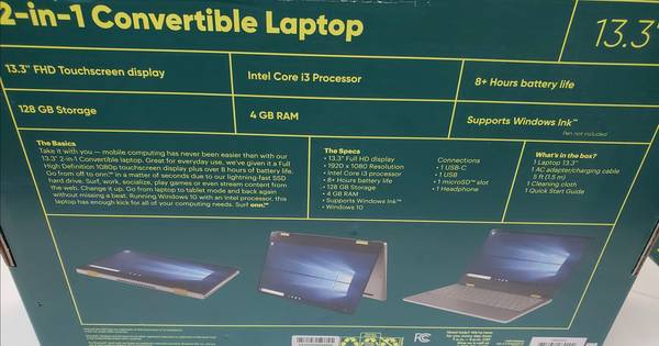 New! 2-in-1 Convertible Laptop: 13.3" FHD Touchscreen display 1920 x 1080 Resolution Intel Core i3 Processor 8+ Hours battery life 128 GB SSD Storage 4 GB RAM Windows 10 Google Classroom Compatible