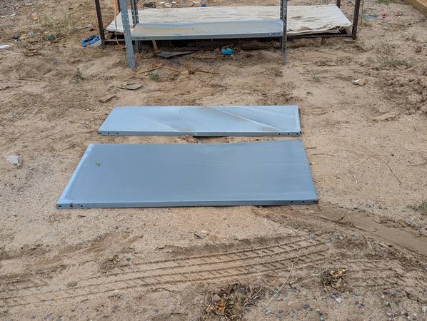 large quantity of metal shelving available. Perfect for warehouse, garage, workshop, parts and supply storeroom stockroom. Vertical uprights are 13 feet tall - $30 each side *Shelf panels are all 4...