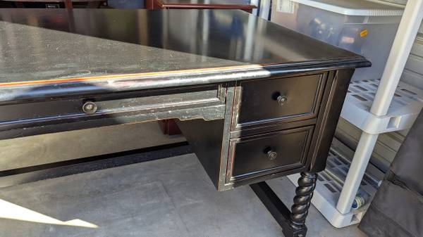 Pier One Desk + File Cabinet - black with red distressed detail. Desk has pull out keyboard drawer (front drops down), file drawer + 2 other drawers. File cab has two drawers, bottom for legal or letter folders.