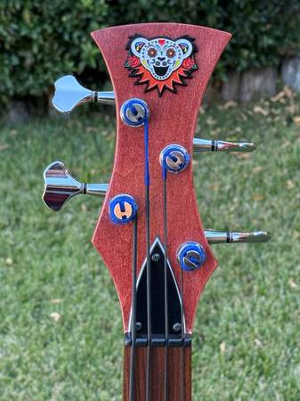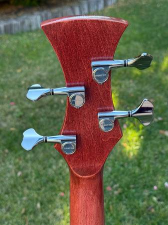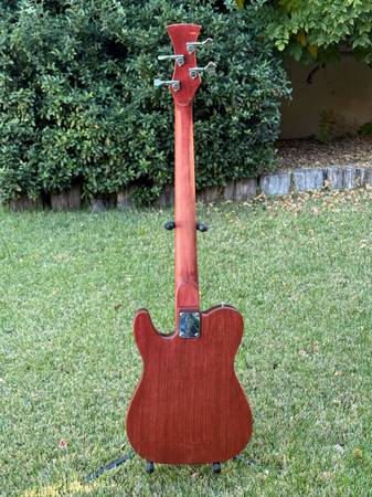 This is a 6.6lb custom 4 string medium scale. It has a sycamore body with a humbucker neck pickup and a musicman bridge pickup. Standard tele controls. The maple neck is 1 5/8” at the nut, 2 1/2” at the heel. Gotoh tuning pegs and D’Addario Tapewound strings.
